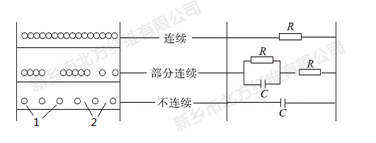 c:一部分導(dǎo)電顆粒完全不連續(xù),導(dǎo)電顆粒間的聚合物隔離層較厚,是電的絕緣層,相當(dāng)于電容器的效應(yīng)。